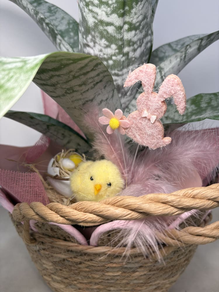 La pianta è valorizzata da dettagli pasquali che donano alla composizione un tocco festivo e raffinato.