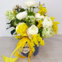 Un’elegante composizione in box dove la luminosità della mimosa incontra la morbidezza dei ranuncoli e la freschezza del viburno.