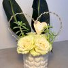 Delicata, elegante e ricca di significato, questa raffinata composizione con rose bianche, piante succulente e componenti vari, è il regalo perfetto per esprimere amore e affetto autentico il giorno di San Valentino. I fiori freschi, selezionati con cura, sono disposti in un elegante vaso in ceramica bianco decorato con cuori in rilievo.