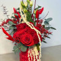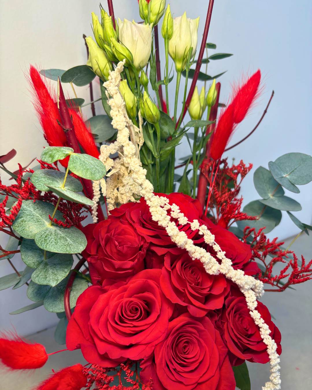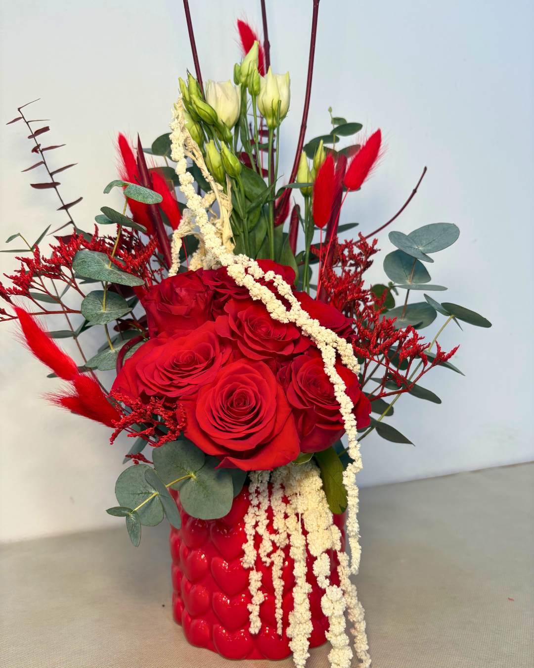 Elegante composizione floreale con rose rosse, lisianthus, eucalipto, limonium ed elementi stabilizzati, inserita in un vaso in ceramica rosso con cuori in rilievo.