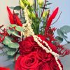 Elegante composizione floreale con rose rosse, lisianthus, eucalipto, limonium ed elementi stabilizzati, inserita in un vaso in ceramica rosso con cuori in rilievo.